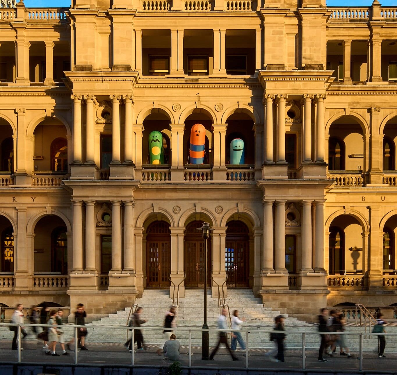 As part of the 2025 Brisbane Festival, Craig & Karl created a pair of large-scale inflatable interventions on two of the city’s bridges, both riffing on the idea of the arch as passageway. Additionally, numerous illustrations, interactive sculptures, and inflatable “Mateys” — a series of quirky characters with expressive faces — pop up on buildings and sidewalks to enable joyful encounters as part of the expansive, city-wide exhibition titled Rear Vision.